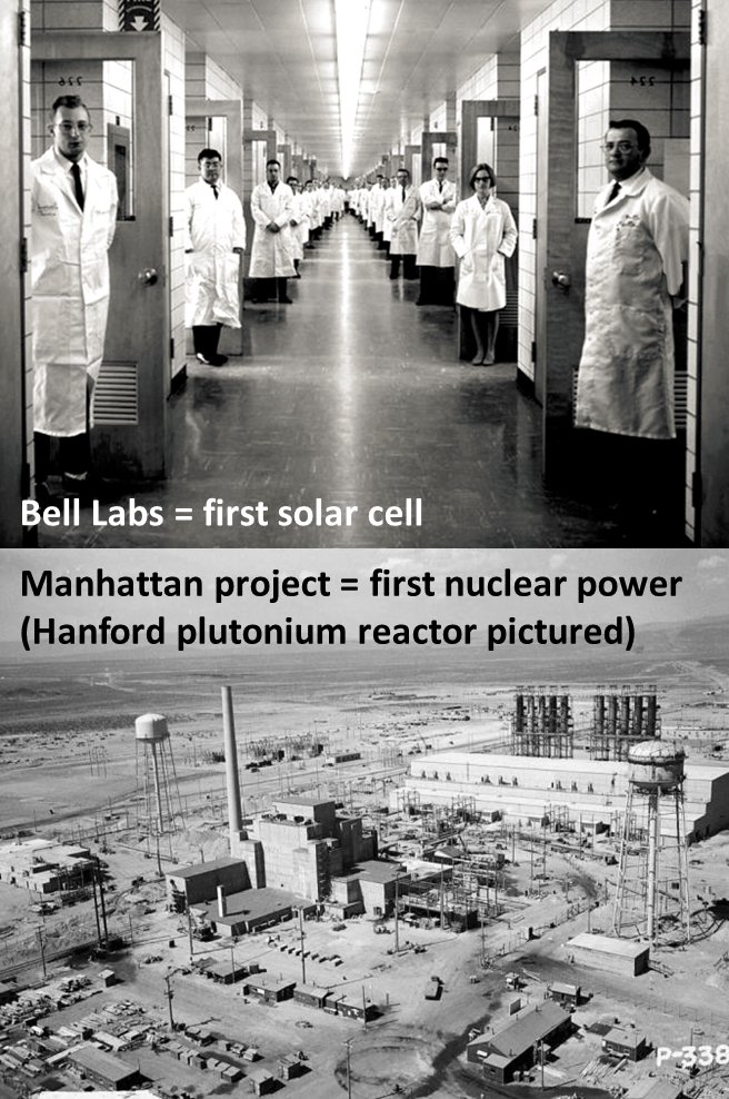 Let’s stick with power generation. When I look for the most recent example of a carbon-free power generation technology that reached mass adoption, I have to go all the way back to the 1950s. In 1951, scientists hooked a steam turbine up to a nuclear reactor and made emissions-free electricity (nuclear fission has its downsides, but “CO2 emissions” isn’t one of them). Three years later, researchers built the first practical solar cell (a photovoltaic with >1% conversion efficiency). Since then: nothing. How were these breakthroughs born?
