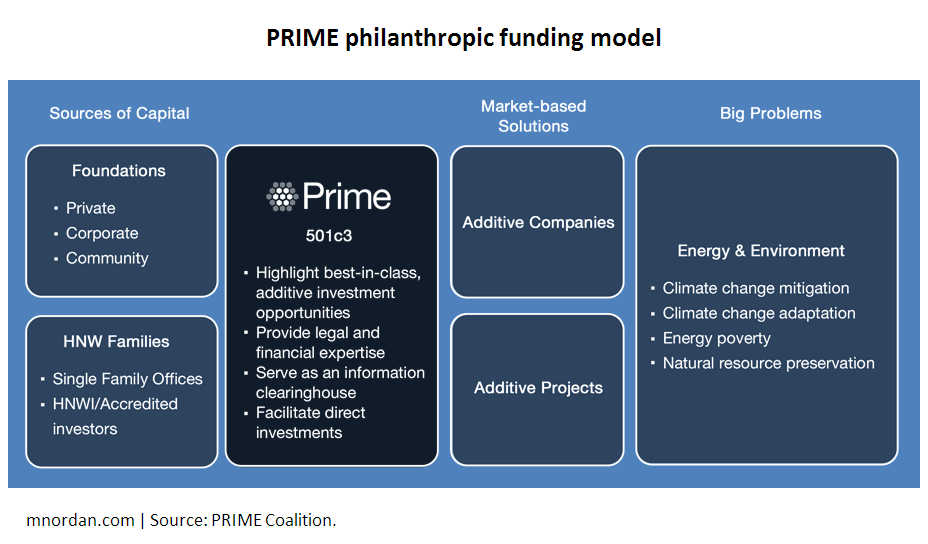 I co-founded PRIME and serve as chairman of its investment committee. (The other committee members will be announced this summer). We’re developing a comprehensive philanthropic investment process. It starts by screening the full universe of early-stage resource innovation projects (energy, agriculture, waste, water) for climate impact and for charitability, and then narrows them down based on attractiveness, misalignment with conventional venture capital, and potential impact at scale. An alpha version of this process led to the Quidnet investment, and the investment committee will go through a full-featured version of it this year.