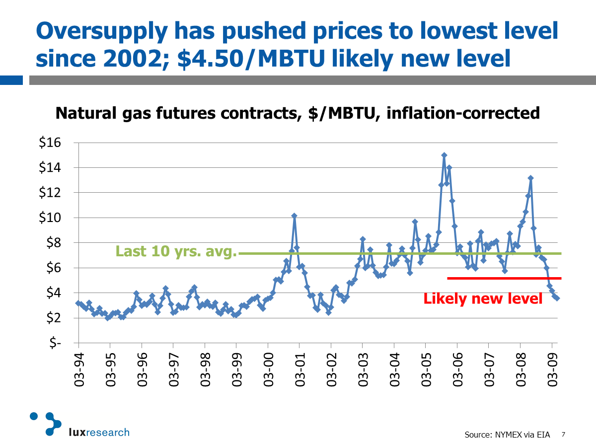 I vividly remember presenting this data in the boardroom of a prominent east coast venture capital firm in early 2009. The partners there knew a lot more than I did about the oil and gas industry, so I approached the talk humbly. If this increase in supply persisted, I said, think of the possibilities! The 10-year average price of natural gas was about $7/mmbtu, but the price going forward could be more like $4.50: