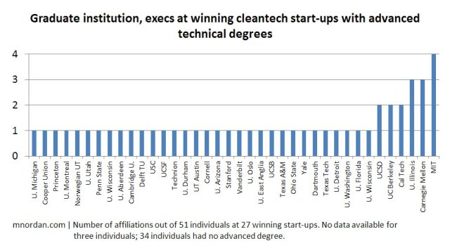 Among graduate degree-holders, no university stood out. In fact, across the 51 successful team members with advanced technical degrees, 39 universities were represented with only three appearing more than twice (MIT, U. Illinois, and CMU):